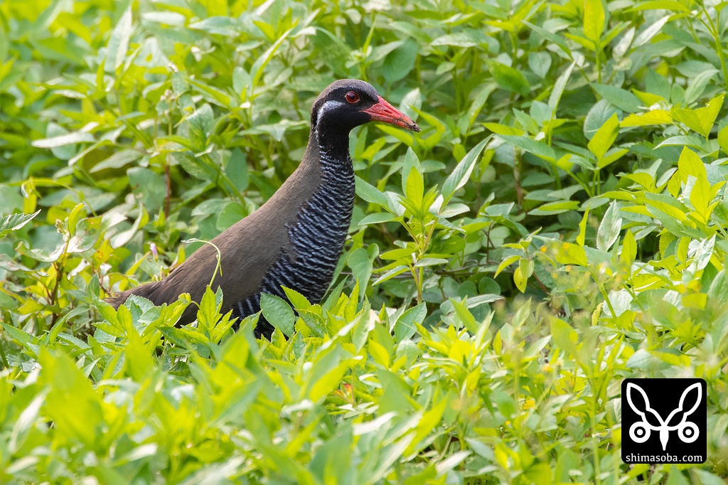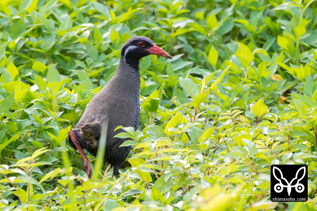 灌木の中かから聞こえるヤンバルクイナの声を聞いていると一定の方向へ少しずつ移動していることが分かりました。その方向の草むらを狙っているとヤンバルクイナがひょっこりと顔を出しました。