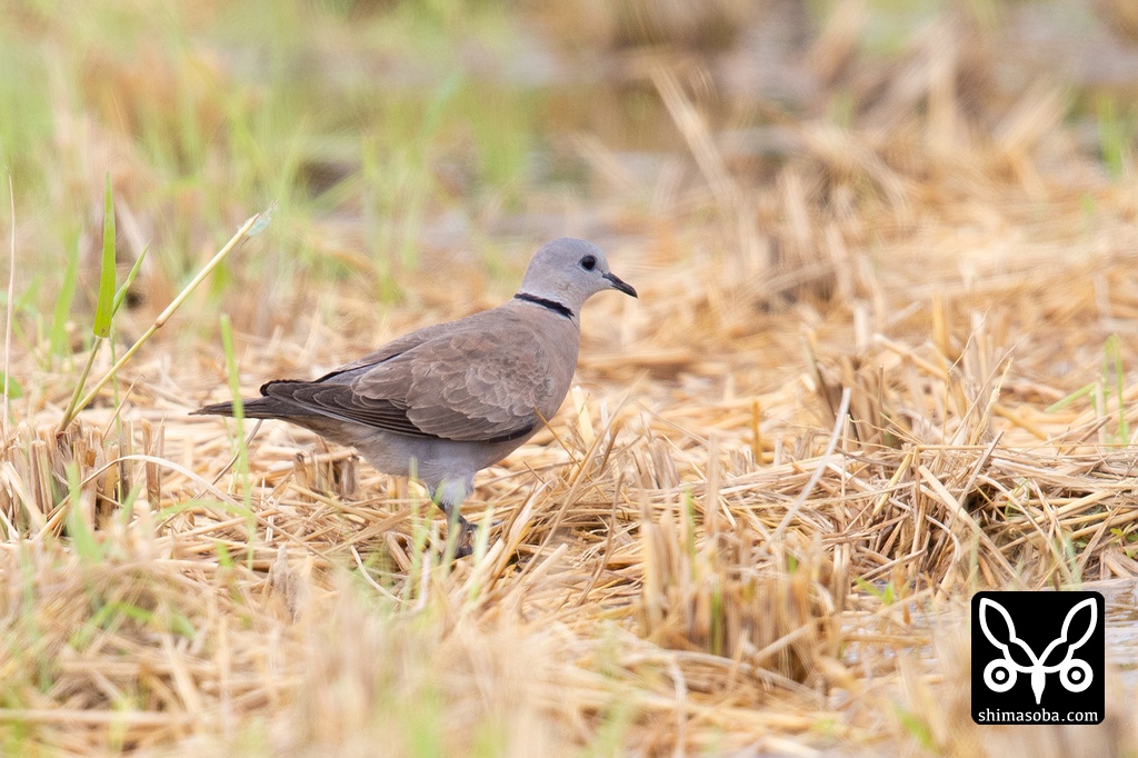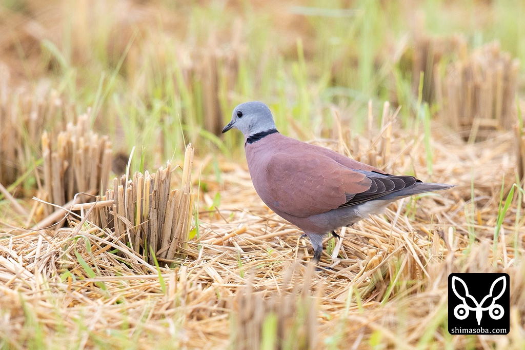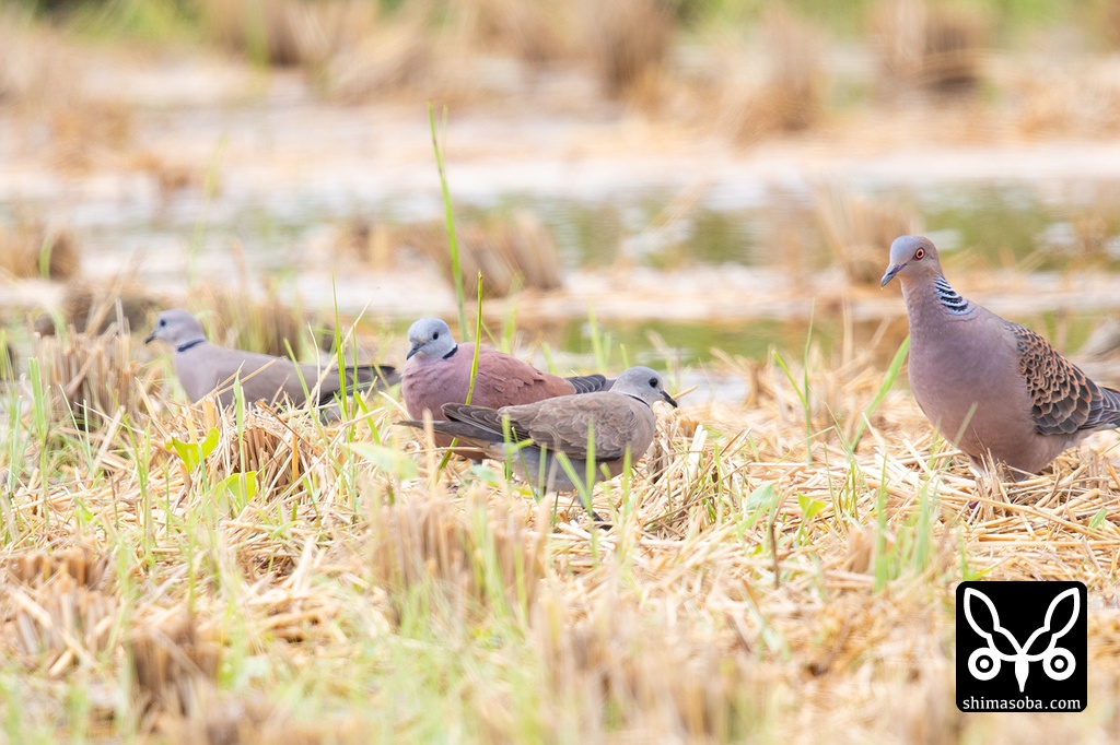 稲刈り後の田んぼでキジバトの群れと落ち穂を拾っていました。撮影しているとツミが上空を旋回してベニバトたちは藪の中へ逃げ込んでいました。