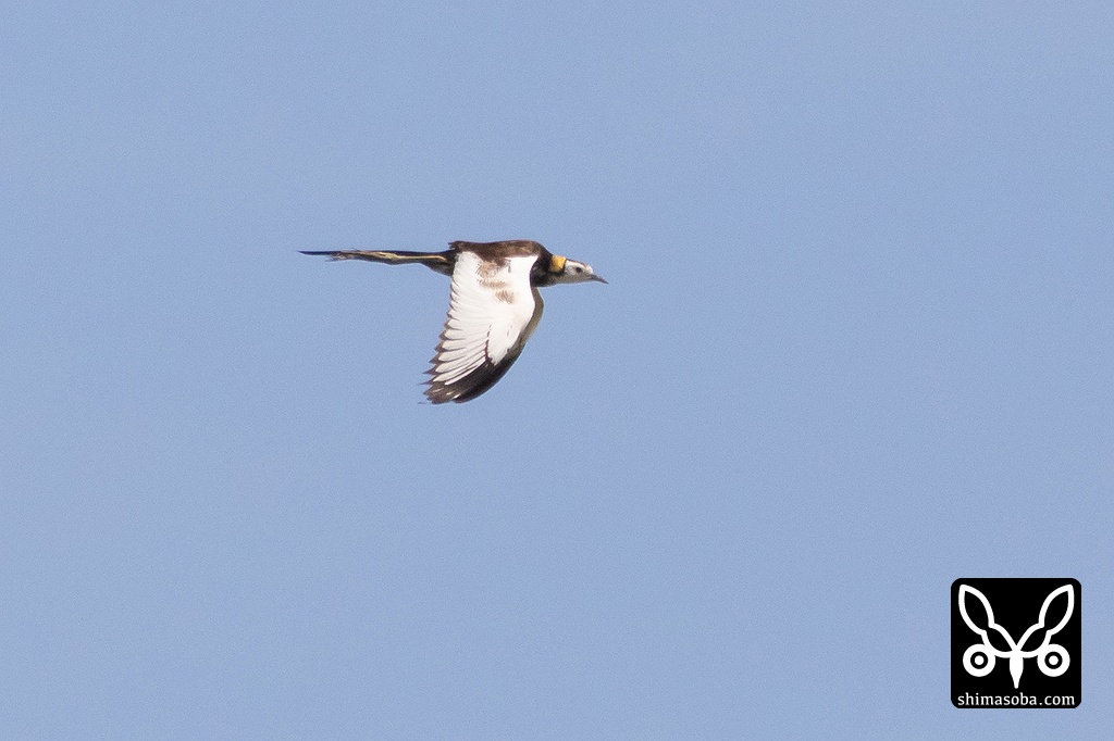 レンカクの飛翔。非常に警戒心の強い個体で農作業の軽トラックが通りかかるたびに飛び回っていた。