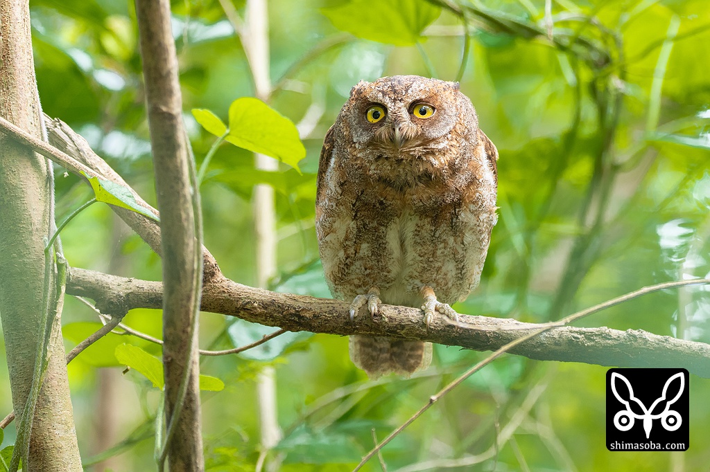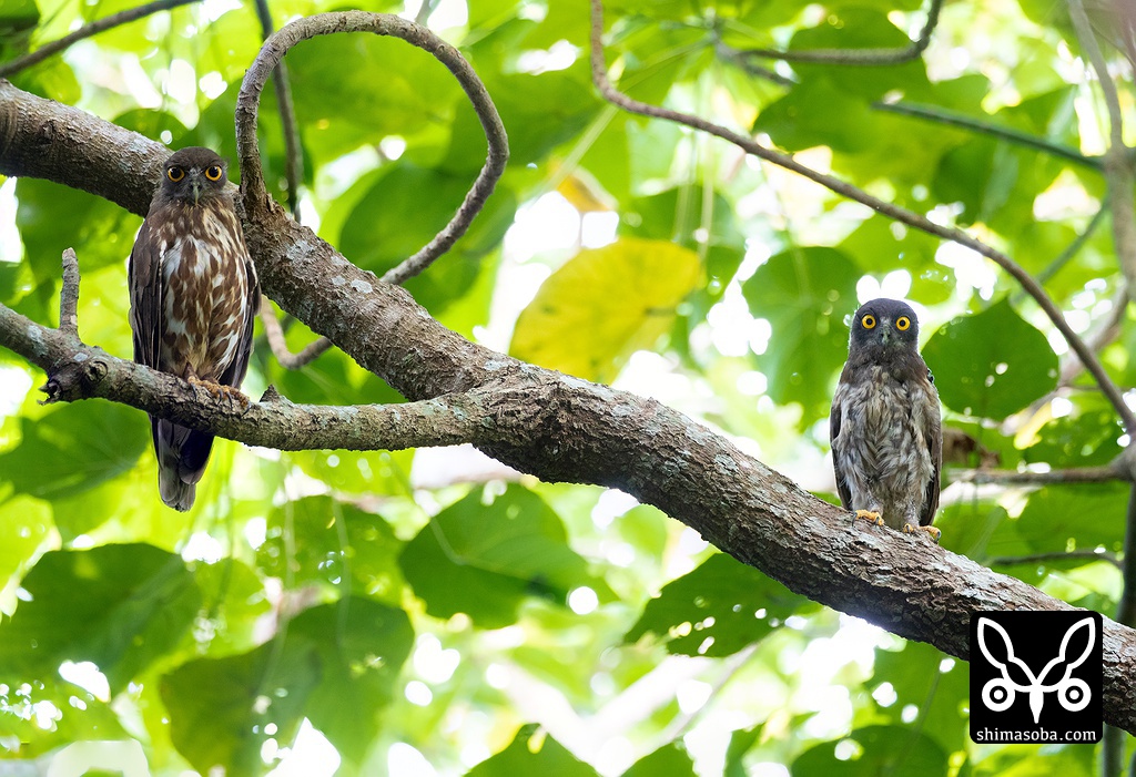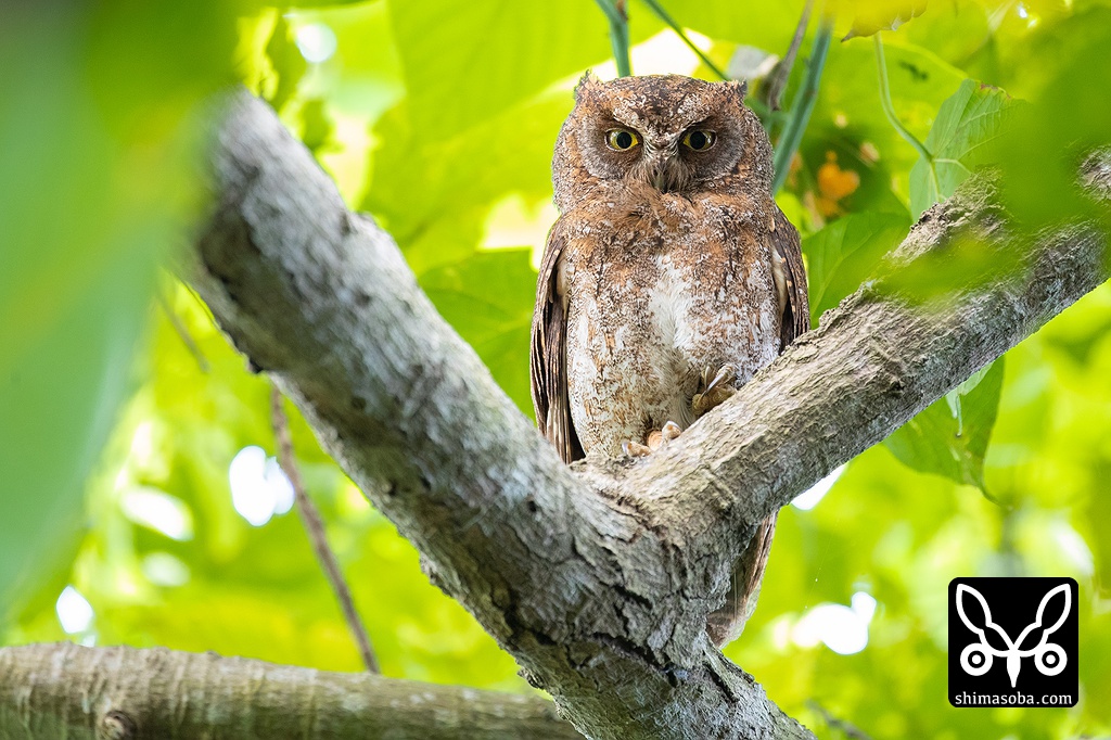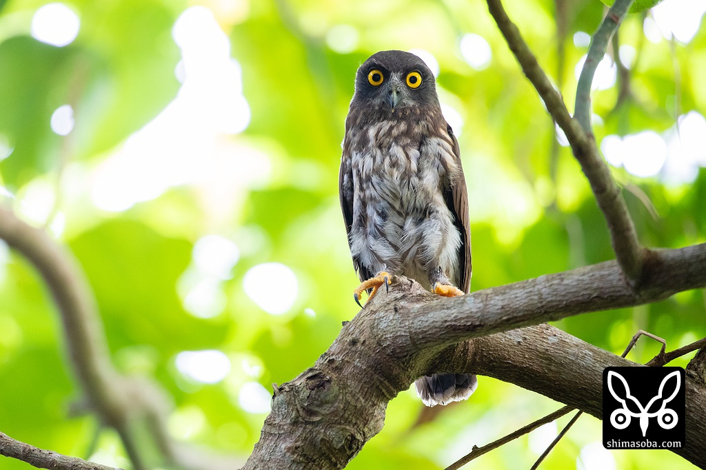 新しいポイントで見つけたアオバズクの巣立ちビナ。巣立って数日が経っているようで自由自在に飛び回っていた。人間への警戒心も多少あった。