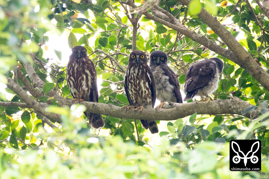 近所のアオバズクは、無事に全て巣立ちました。写真には写っていませんがもう1羽が近くにいる3兄弟。親鳥は左がオスで右がメスです。