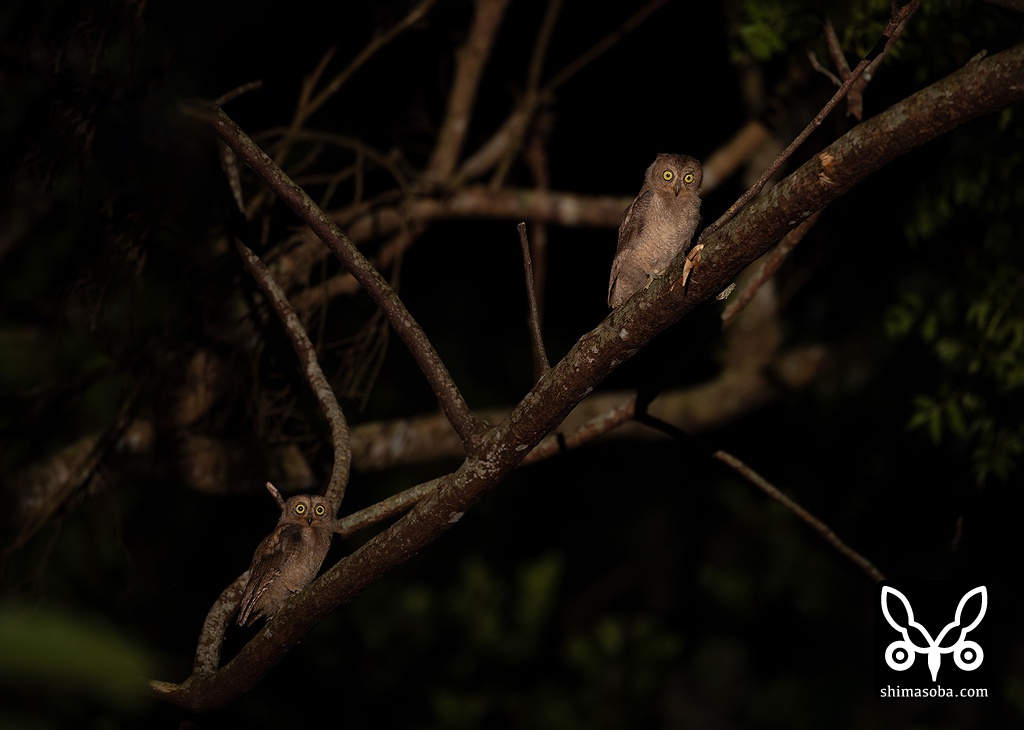 2羽の兄弟。沖縄本島もコノハズクの巣立ちは今が最盛期なので厳しい時間帯にもかかわらず、8家族を確認できました。コノハズクのヒナたちは深夜0時すぎたぐらいには眠っちゃうことが多い。