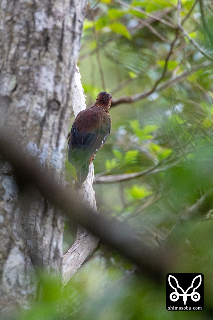 少し場所を変えて私が唯一知るカラスバトが周年見られるポイントへ移動。この日は5羽のカラスバトを確認しましたが、写真はいつも難しい。1羽は地上に近い茂みから飛び出したので「営巣か!?」と一人、色めき立ちましたが足場も悪く帰る飛行機の時間も迫っていたので確認できませんでした。カラスバトの繁殖を記録することが当面の目標。