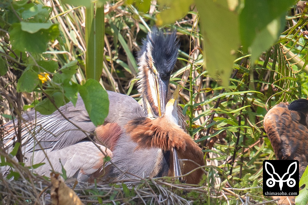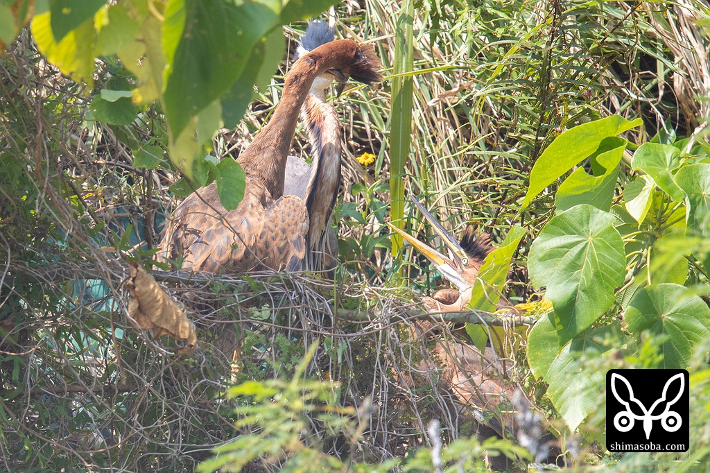 給餌間隔が非常に長いムラサキサギですが、やっと親鳥がヒナたちへ餌を与えているところを観察できました。