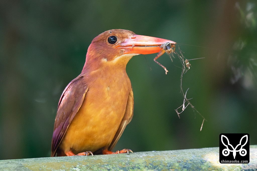 マダラコオロギを捕まえたアカショウビンの幼鳥。クロツグの藪に突っ込んでとっていました。