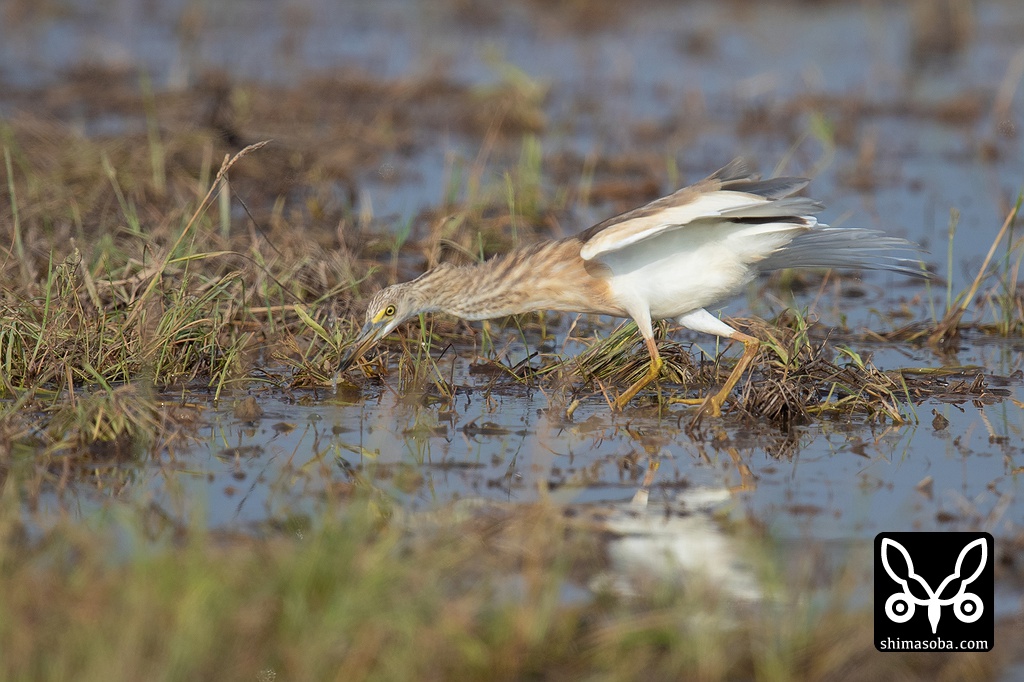 ジャワアカガシラサギは警戒心もなく、田んぼでコサギやセイタカシギ、タカブシギなどと餌をとっていた。