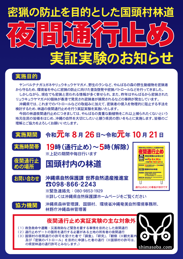 ただし、国頭村の規制時間が日の入りから日の出までと季節変動があるのに対し、沖縄県の方は、午後7時から午前5時までとなっていますので留意ください。