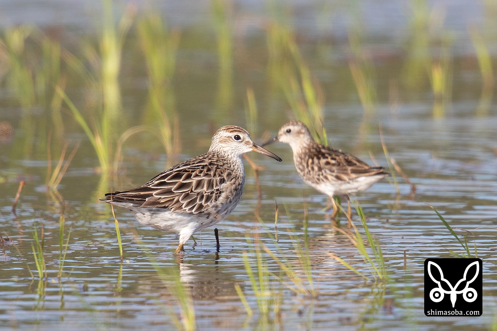 ウズラシギ 成鳥。冬羽へ換羽しつつあります。後ろはヒバリシギ。