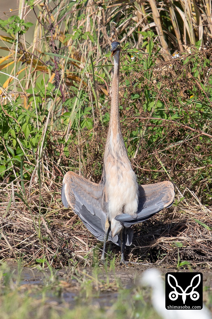 ムラサキサギの幼鳥は翼を広げて虫干し中。