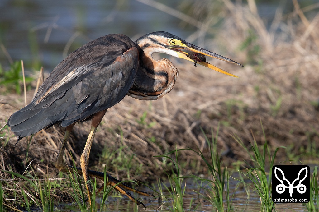 カメを仕留めたムラサキサギの成鳥。