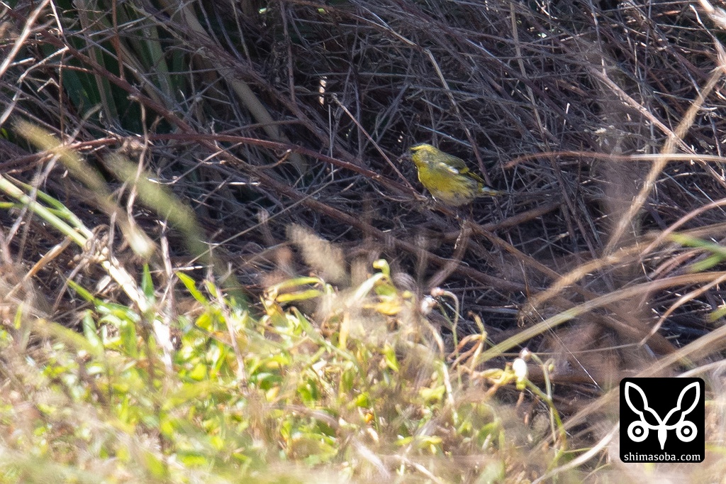 マヒワは1羽だけ田んぼの畔にはえたススキの根元で採餌していました。かなり距離があり、双眼鏡で見つけた時は黄色が目立ちドキッとしましたが、ふつーのマヒワでした。^^;