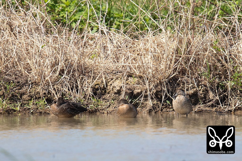 コガモはあちこちの田んぼに大量に入っていた。一番左の個体はオスのエクリプスですが、生殖羽が数枚見えていますね。