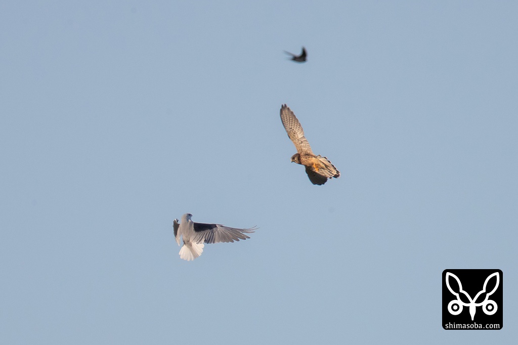 カタグロトビとチョウゲンボウの戦いを傍目に周りをツバメが飛び回っていました。