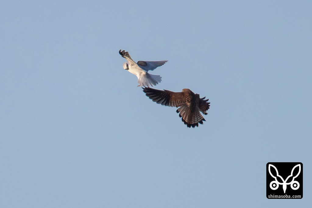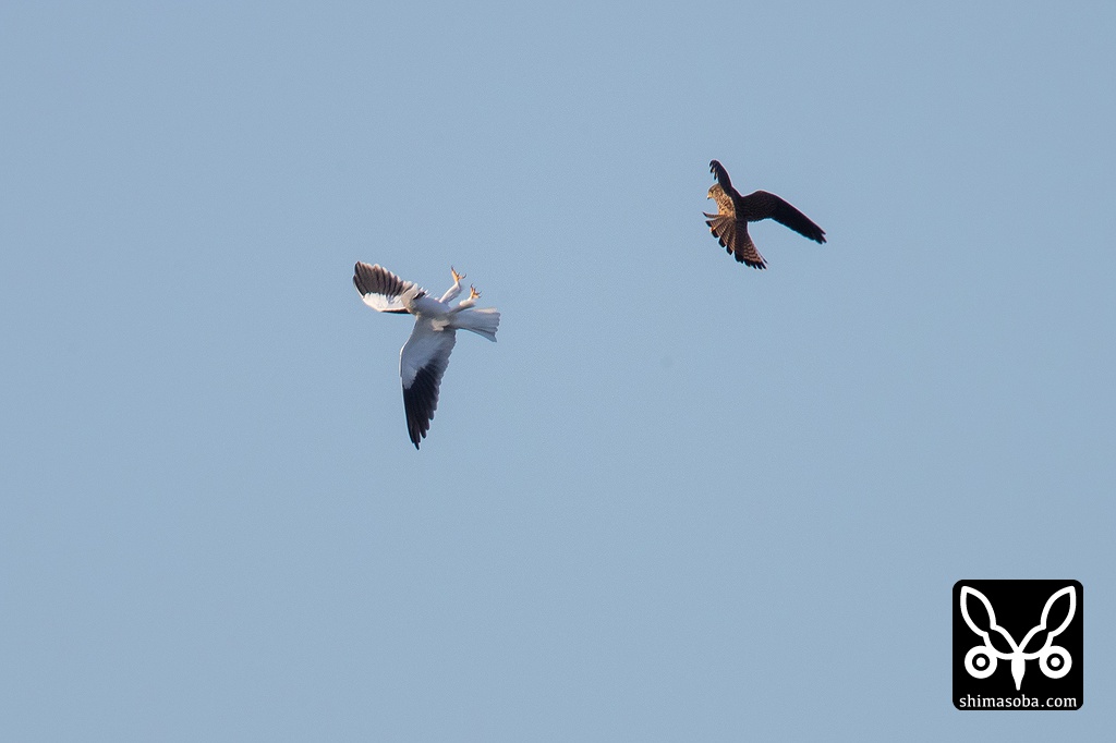 朝、農地を回っているとカタグロトビがホバリングしていました。かなり距離があったので双眼鏡で見ているとチョウゲンボウがアタックしていた。