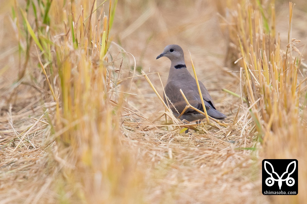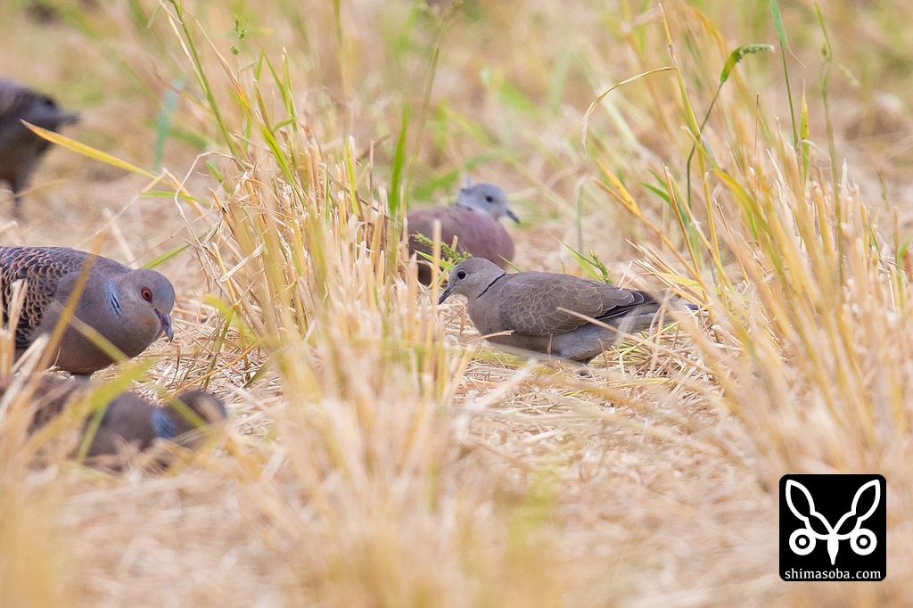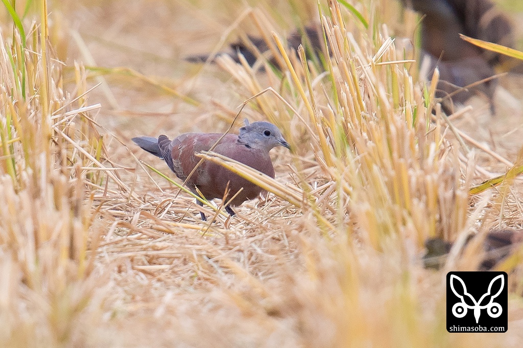 ベニバト3羽はキジバト数十羽の群れの中にいました。この居ついている田んぼは、稲刈り機の性能なのか、切り取った株が切れ味の悪いナイフで切ったようにボサボサ。さらに残った切り株の背が高くベニバトが隠れてしまいます。