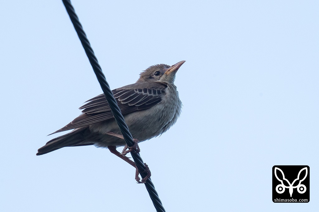 バライロムクドリ幼鳥。昨日見つけたねぐらの前の電線に止まりました。
