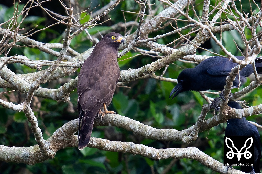 カラス2羽に絡まれる暗色型サシバ。ブラックサシバとは言え、カラスに比べると暗色ですね。