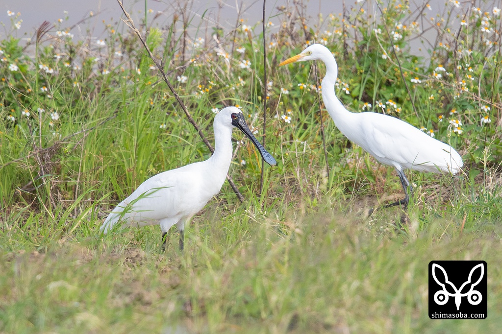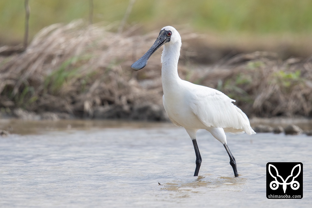 レンカクを観察していると大きな白い影が上空から降りてきました。クロツラヘラサギです。田んぼをマイペースで歩き回りながらしゃもじのようなくちばしを左右に振り、水生生物を捕まえていました。