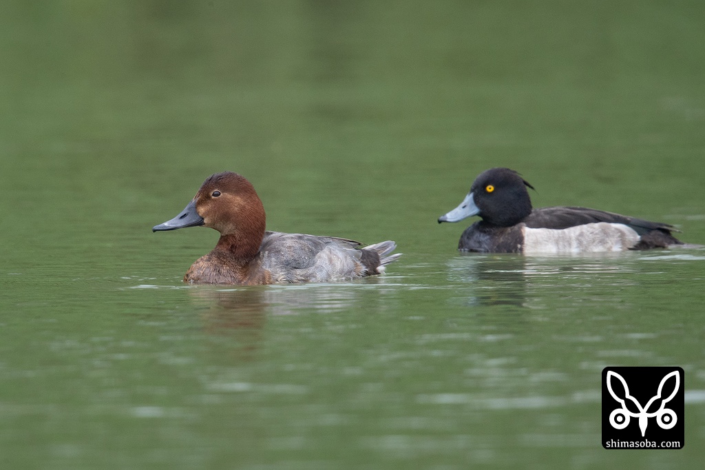 今季初確認のホシハジロ。第1回冬羽のメス。右はキンクロハジロのオス生殖羽。