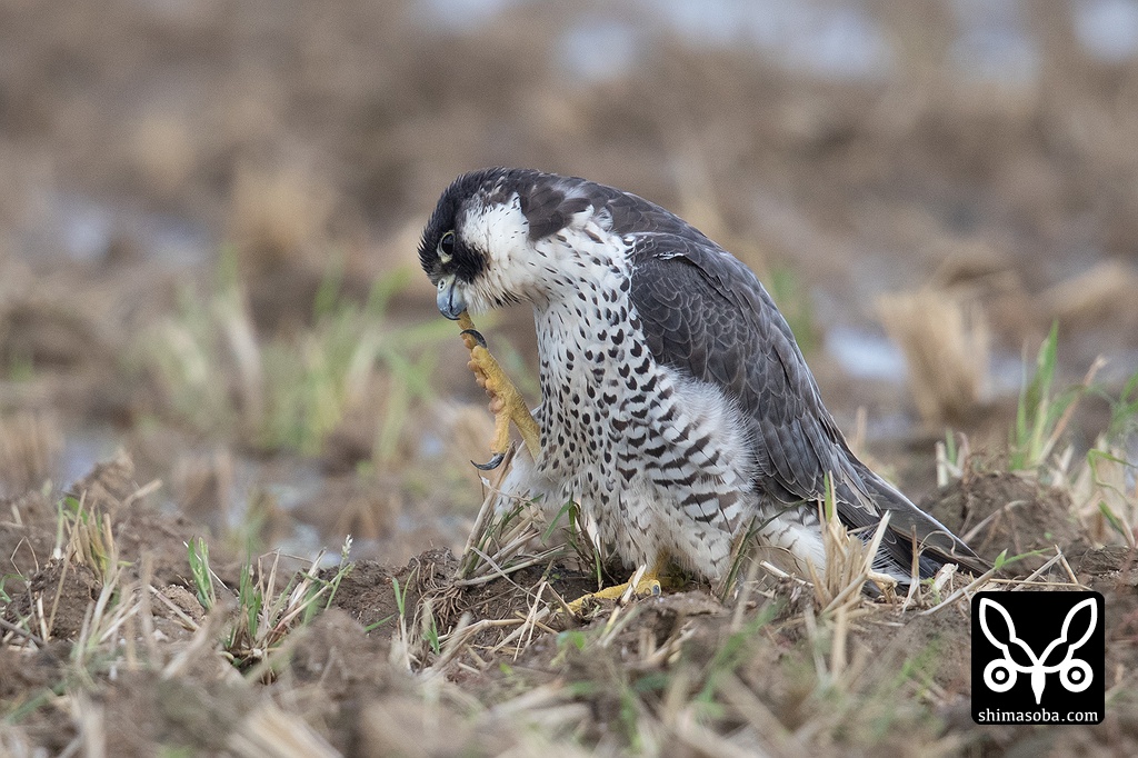 同じ田んぼにカタグロトビとハヤブサがいました。ハヤブサはコウライキジに突撃していましたが失敗。カタグロトビは首尾よくネズミを捕まえました。