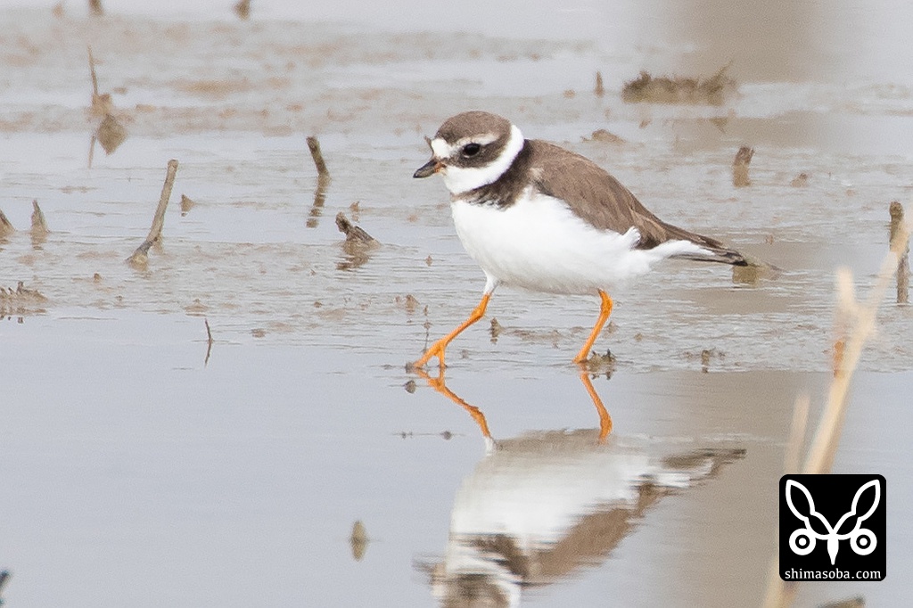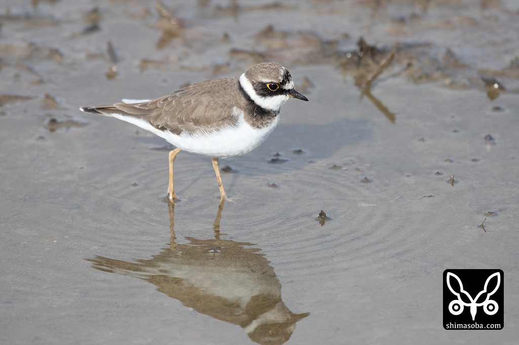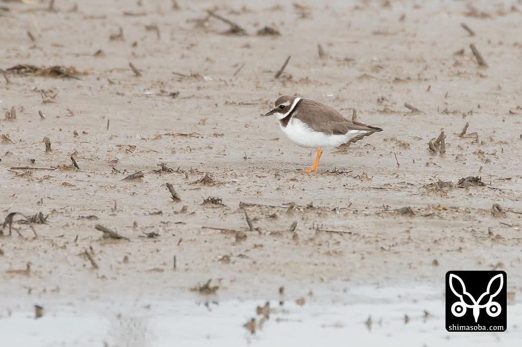 この個体についてはミズカキチドリかハジロコチドリかでさまざまな意見があるようですが、中趾と内趾の間に小さな蹼が認められるのと中趾と外趾の間の蹼がハジロコチドリより明らかに大きいこと、1月の時点でくちばしの付け根に赤みが残っていること、過眼線が口角まで届いていないことなどからミズカキチドリだと思われます。