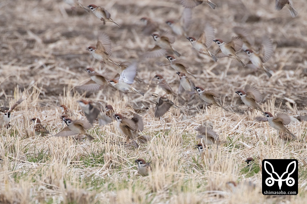 スズメの大群にニュウナイスズメがたくさん混ざっていた。
