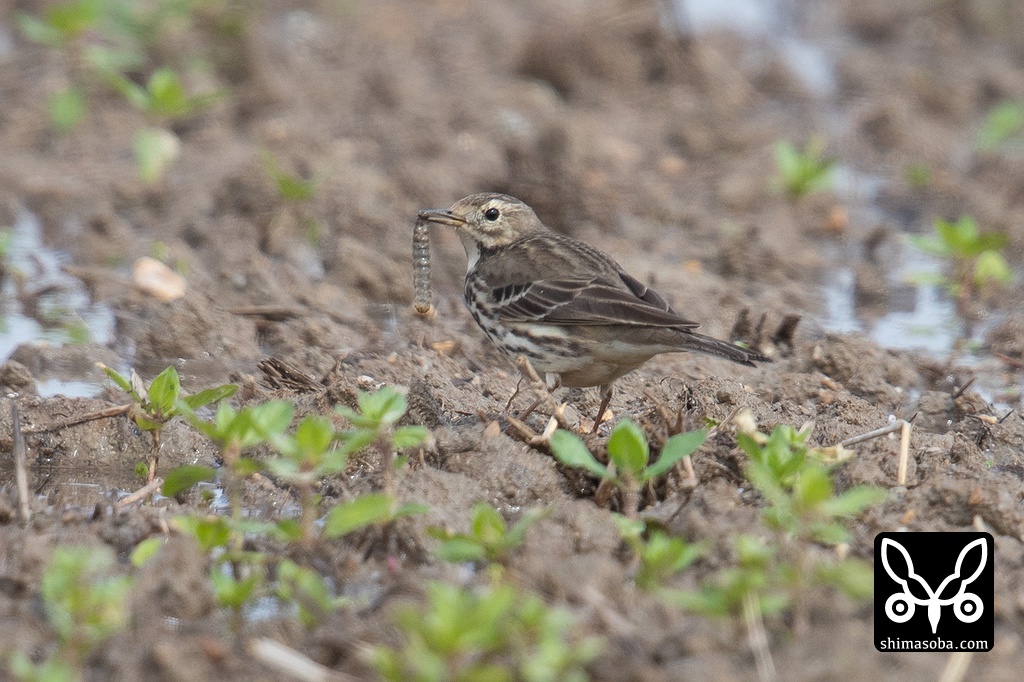 何かの幼虫を捕まえたタヒバリ。