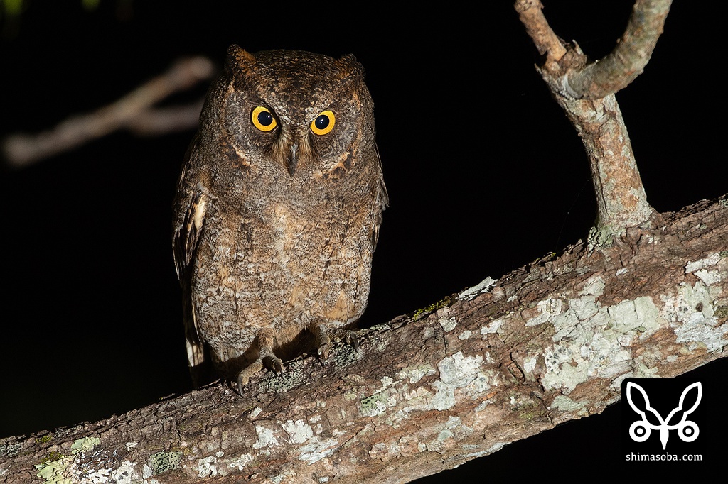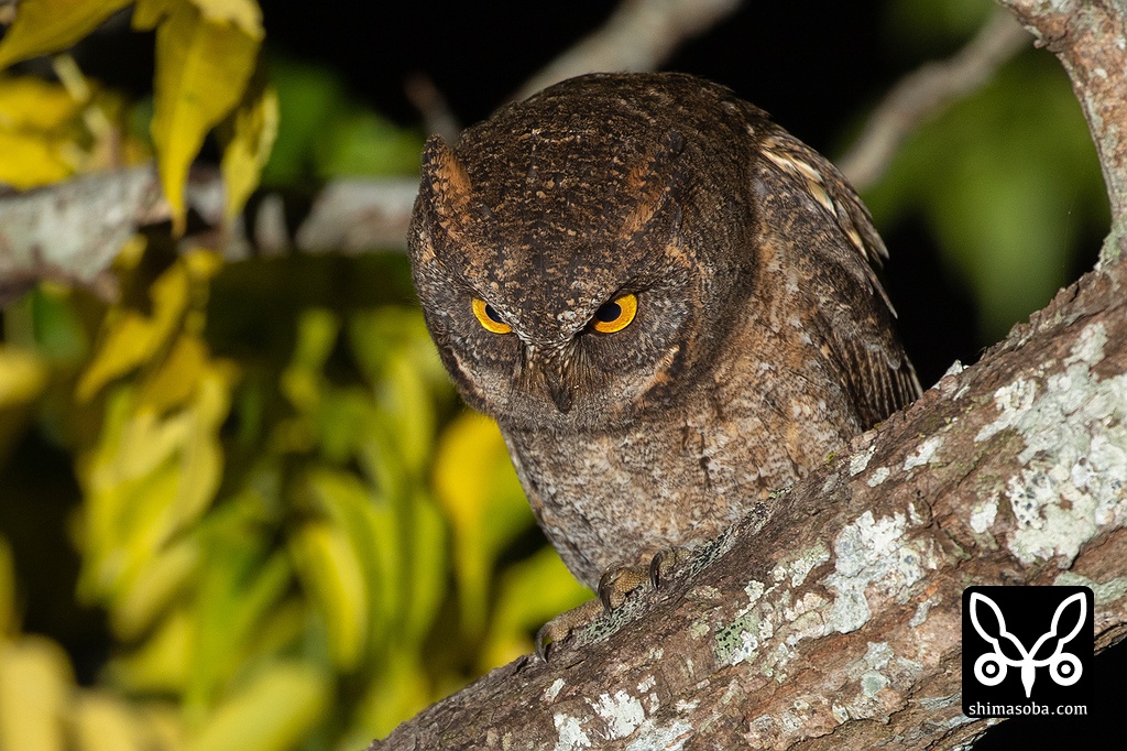 車の前照灯に誘引される虫に狙いを定めるリュウキュウコノハズク。