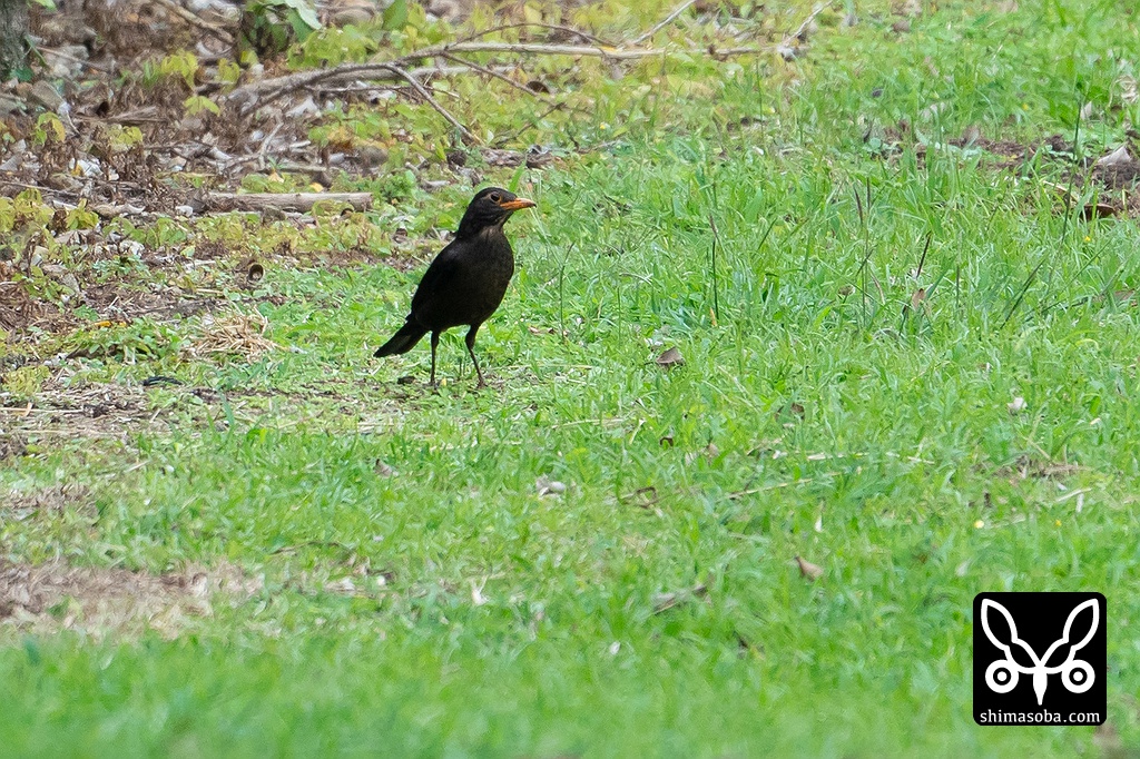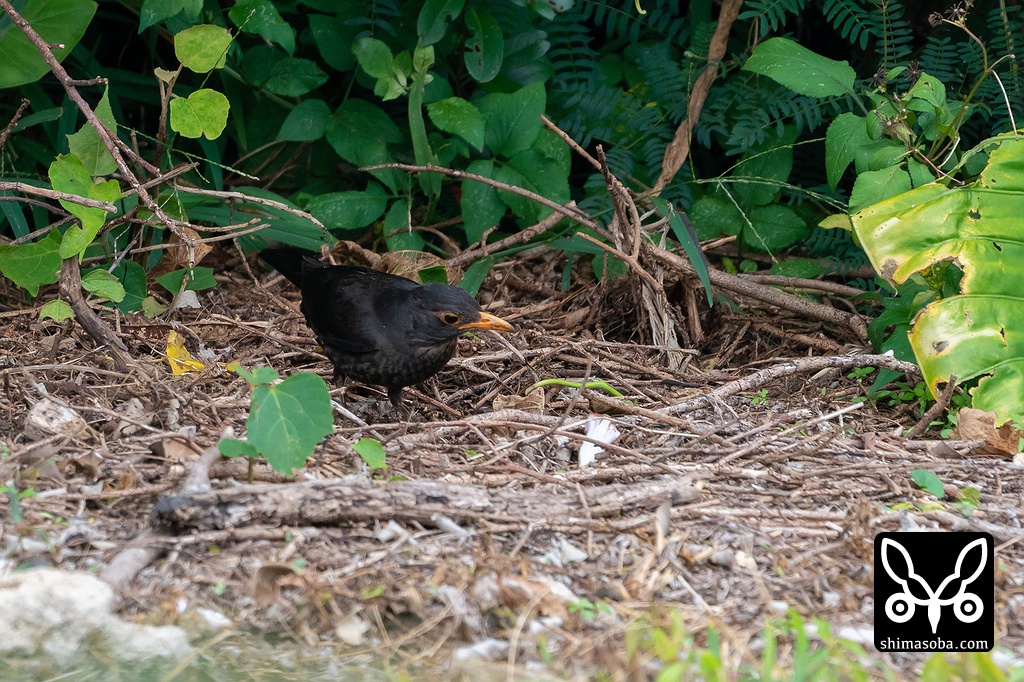 クロウタドリは枯れ草をかき分けて虫を探しているようです。