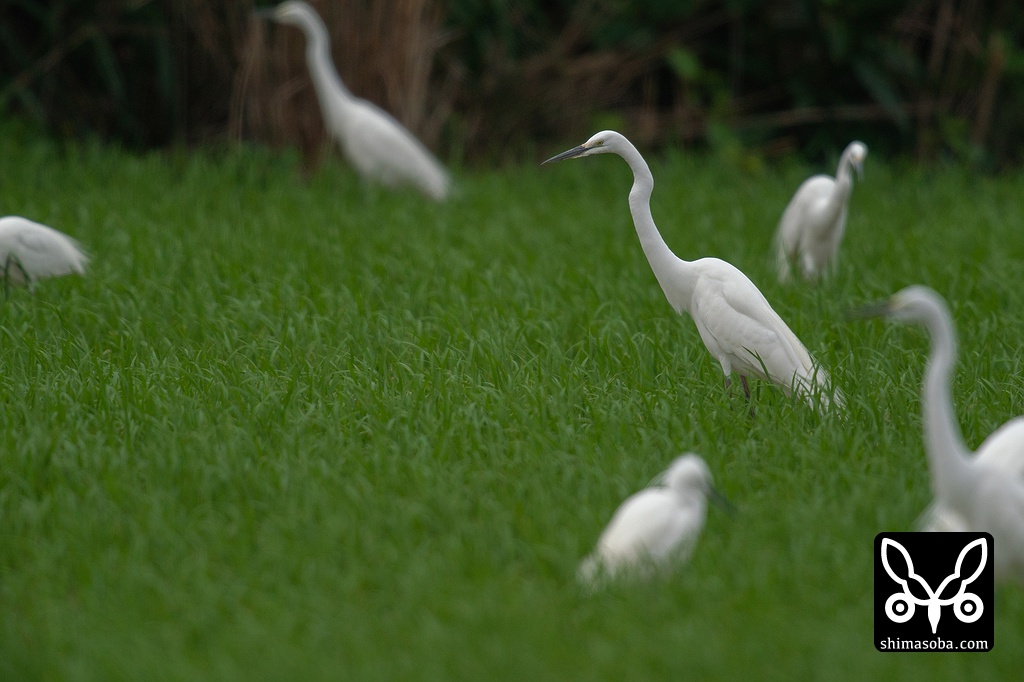 サギはダイサギ、チュウサギ、コサギ、アマサギが田んぼに群れていた。石垣島のダイサギは、この時期にしか見られません。この個体は、体がひときわ大きく、脛が淡色なのでいわゆるオオダイサギと思われる。