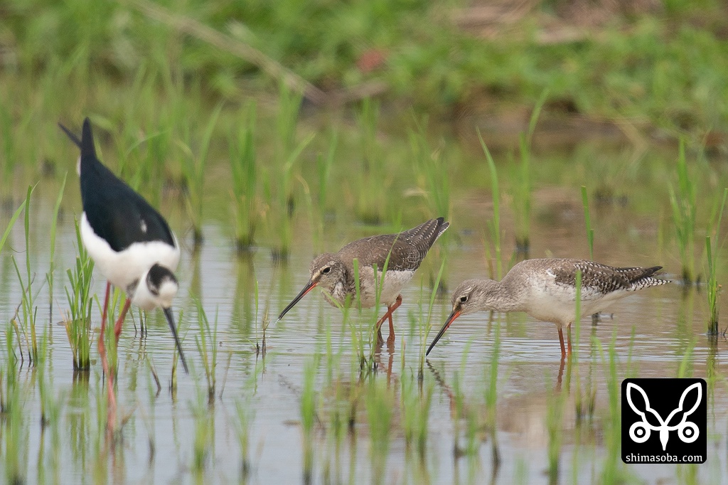 田んぼには、ツルシギ、セイタカシギ、オジロトウネン、アオアシシギ、コアオアシシギ、タカブシギ、ケリのほか、越冬しているムネアカタヒバリやアマサギなどが美しい夏羽に変わっています。