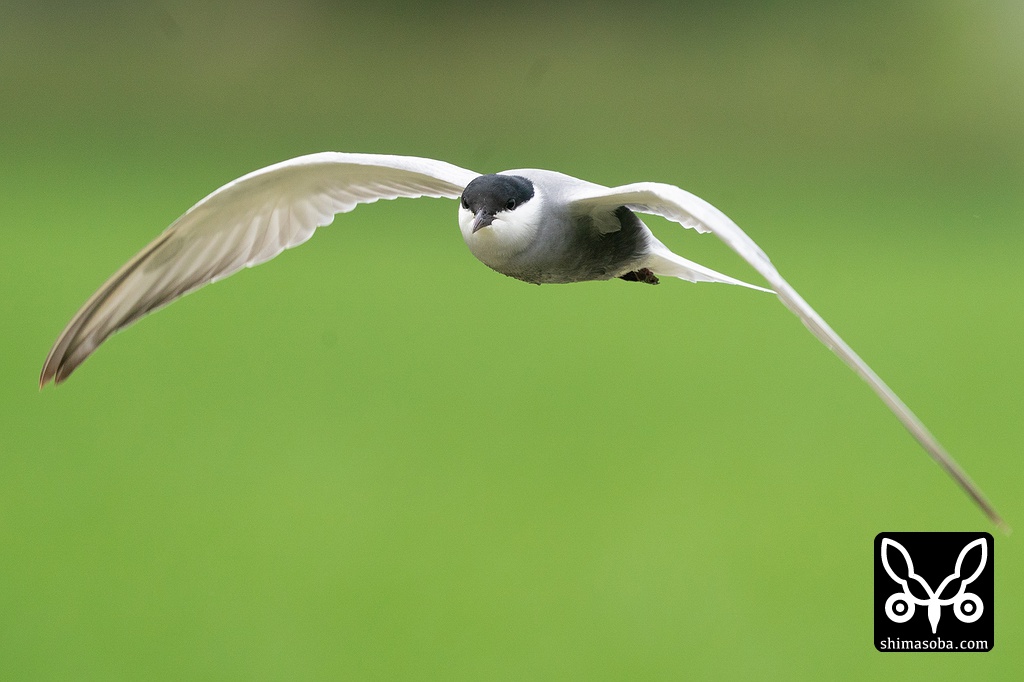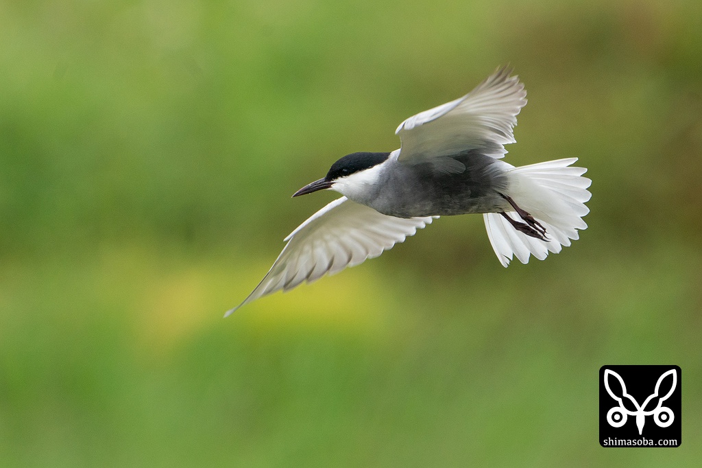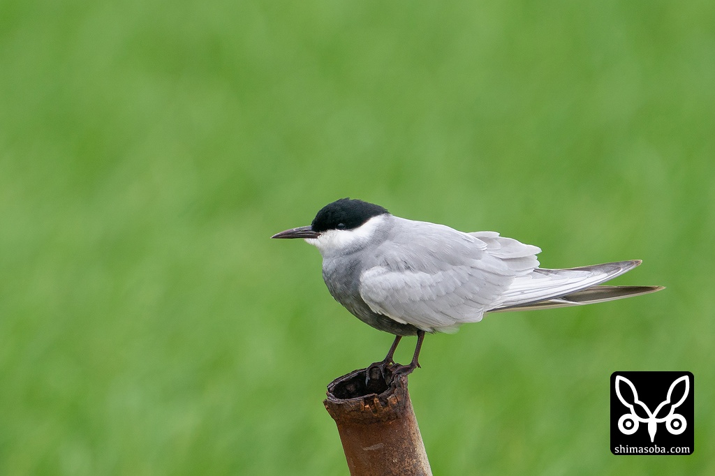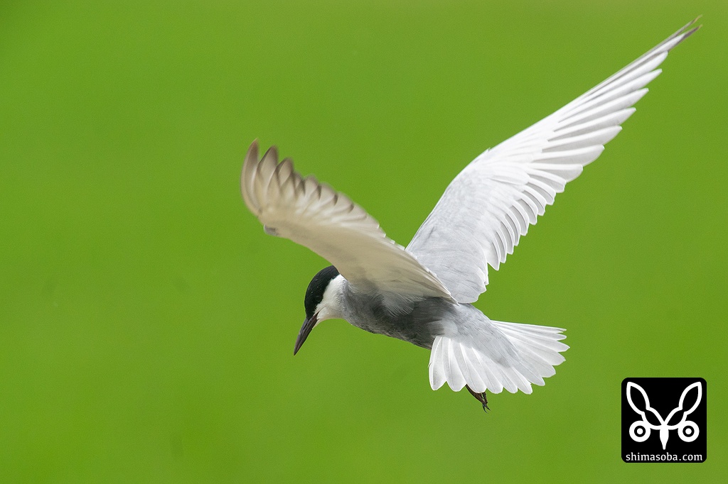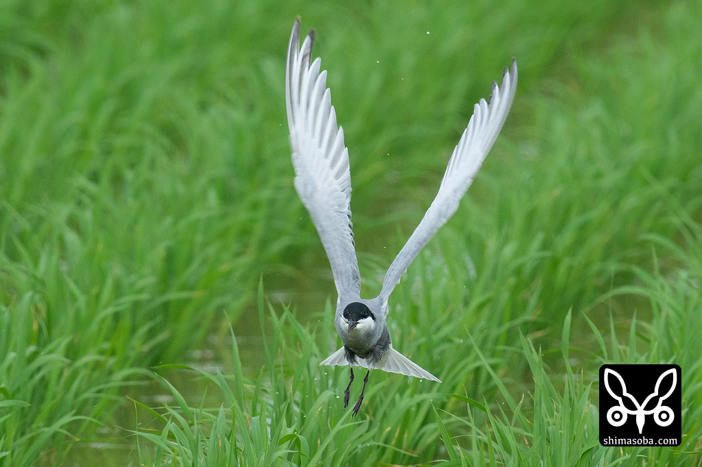 田んぼに今季初となるクロハラアジサシがいました。田んぼの上を飛び回りながら、トンボを稲の間に見つけると急旋回、急降下して捕まえていました。