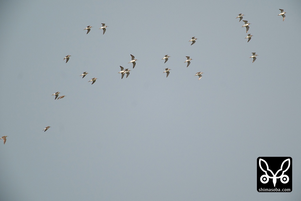 カタグロトビに驚いて飛び上がったタカブシギの群れ。オジロトウネンも2羽いる。