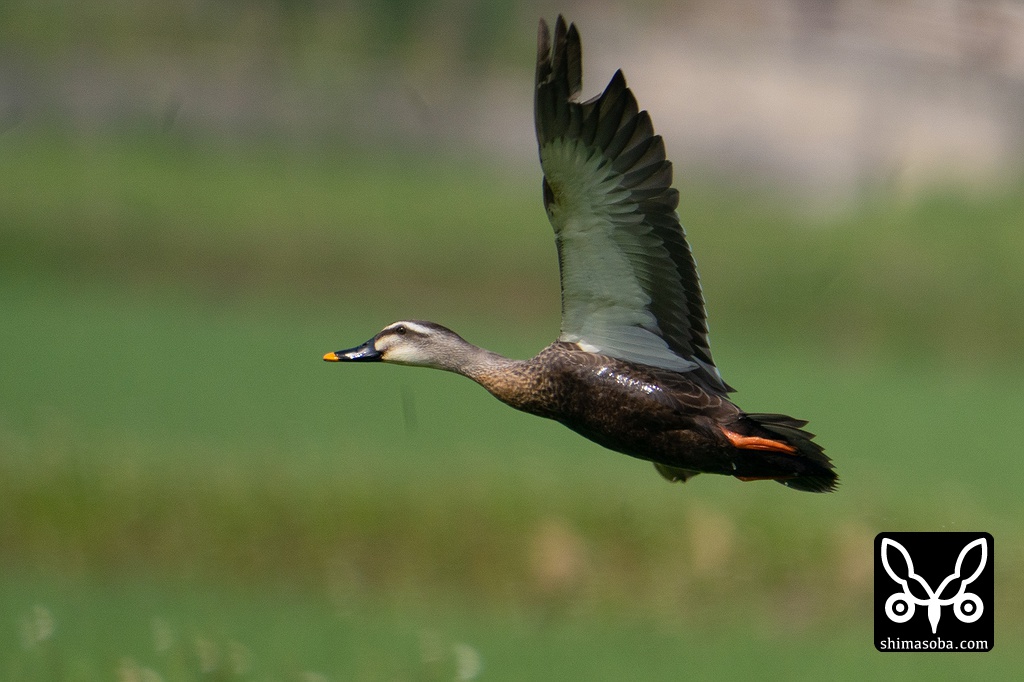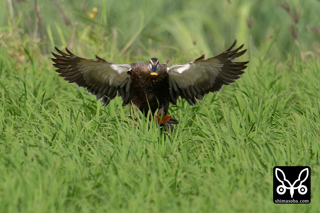 田んぼに降り立つカルガモ。この後、シマアジのオスも降ってきました。