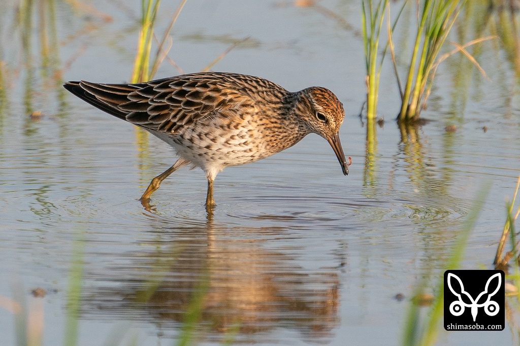 ウズラシギ夏羽。小さなミミズのような獲物を捕まえた。