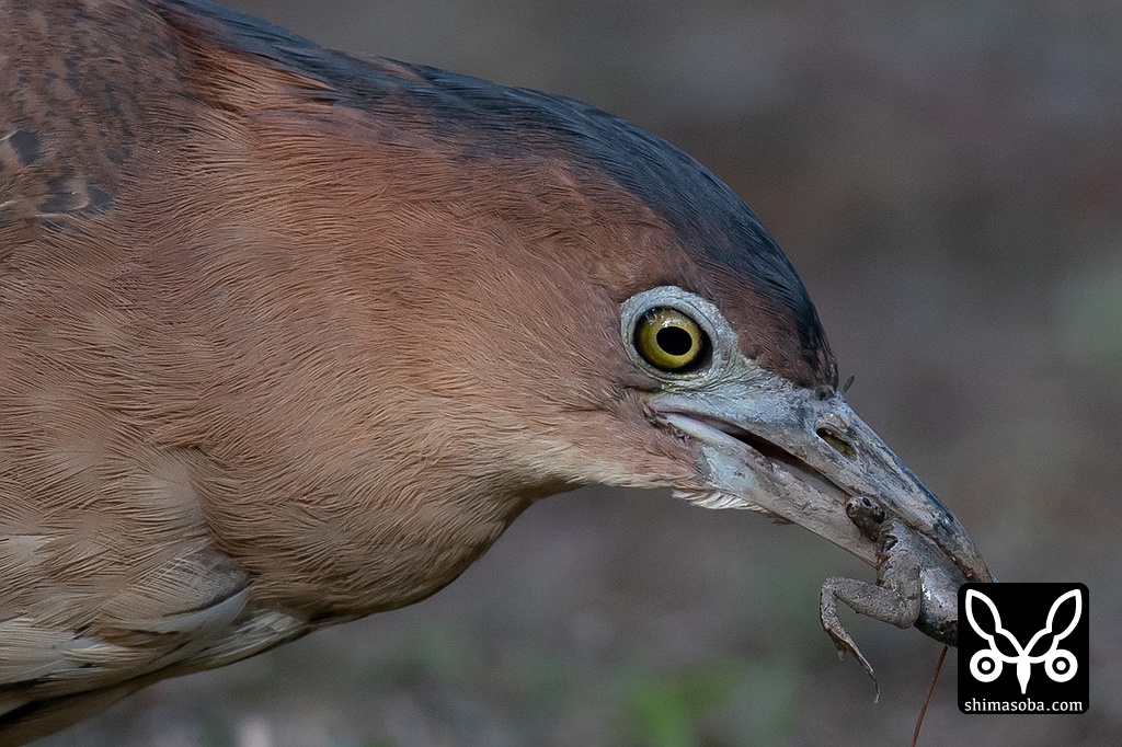 ヒメアマガエルを捕まえたズグロミゾゴイ。