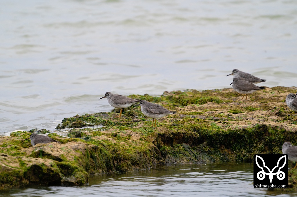 キアシシギは20羽ほどの群れ。どの個体も夏羽に変わりつつあります。