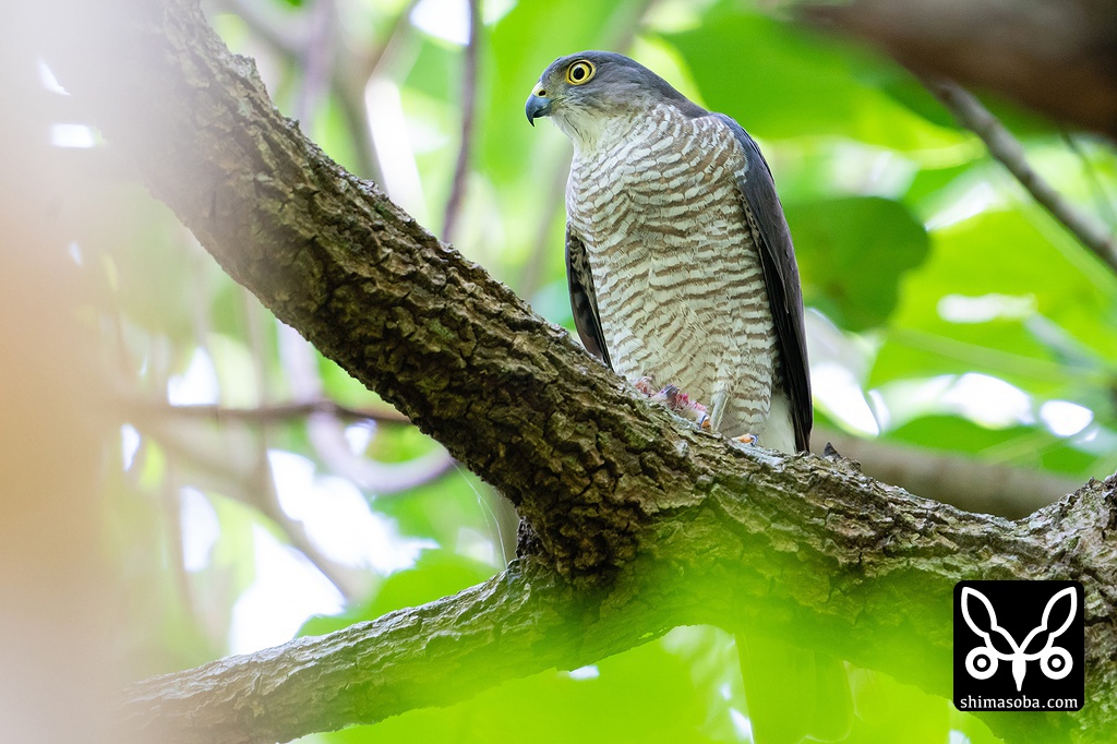 リュウキュウツミのメス。足にはオスから渡された小鳥をにぎっています。