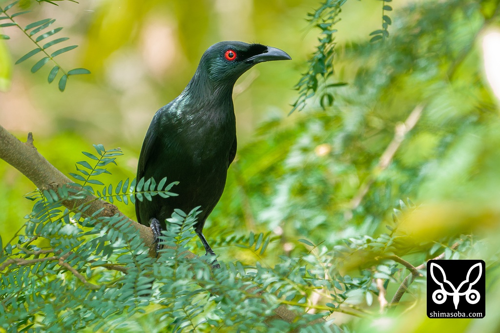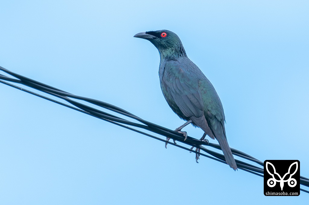 光の角度によっては、金属光沢を帯びた美しい姿を見せてくれました。ミドリカラスモドキの名が示す通り、深い緑色の羽と赤い目が印象的です。