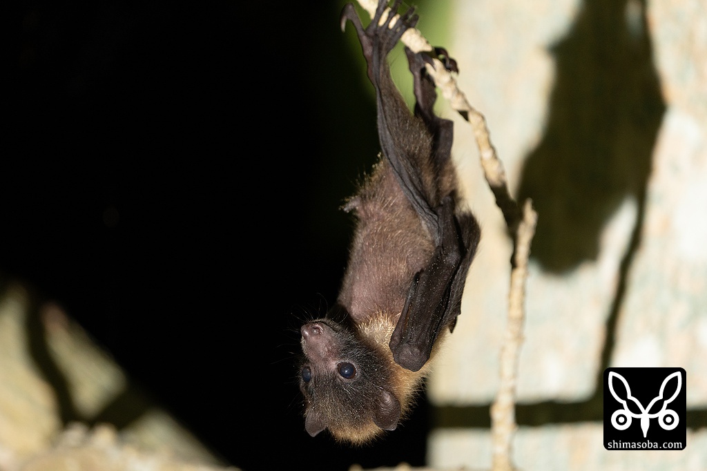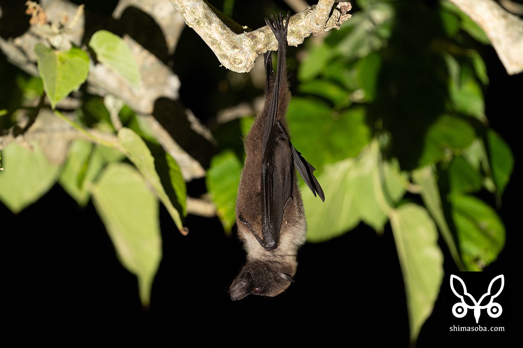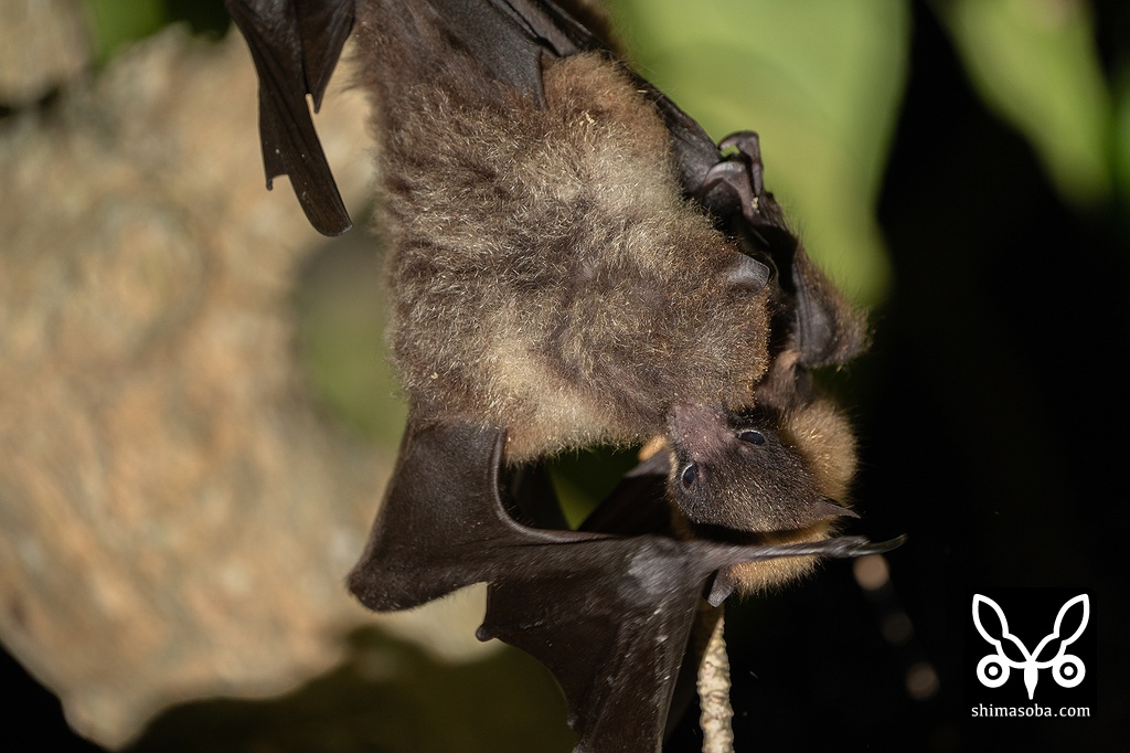親も近くにいるのですが、地面に降りることができないようで木にぶら下がって心配そうに幼獣を眺めているばかり。仕方がないので親指にあたる翼から飛び出た爪をつまんで草むらから引っ張り出した上で三脚を使い、木の枝へぶら下げることに成功しました。しばらく見ていると親がやってきて感動の再会を果たし、暗闇へ消えていきました。