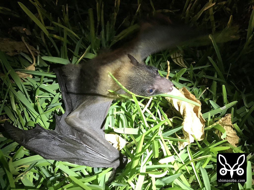 アオバズクを確認した後、リュウキュウコノハズクのポイントへ到着すると早速コノハズクを発見したのですが、何か闇の方から聴き慣れない叫び声がします。懐中電灯片手に車を降りて声のする方へ行ってみると高さ3メートルほどの木の根本から「ギャーギャー」という声。よくよく調べてみるとヤエヤマオオコウモリの幼獣が草の中に落ちていました。