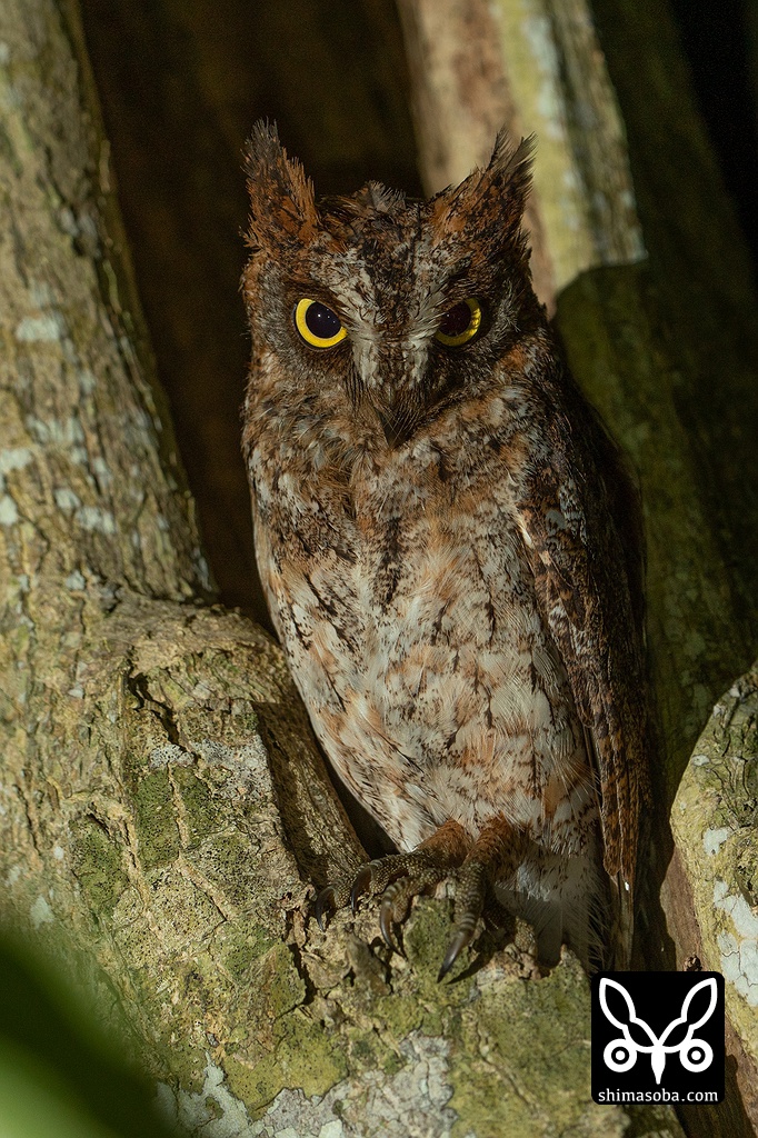 コノハズクのメス。上のペアとは別。深夜0時をすぎてもまだヒナたちに餌を運んでいました。