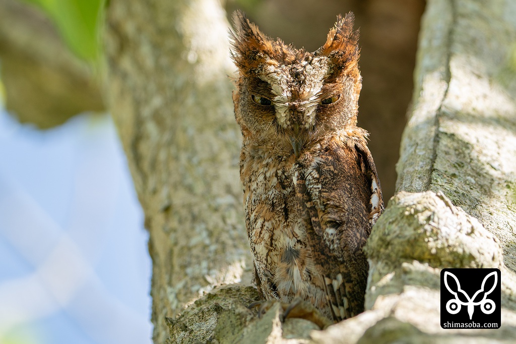 近くで巣を見張るコノハズクのオス。上の個体とペア。やっと昼間にいる場所が分かりました。^^