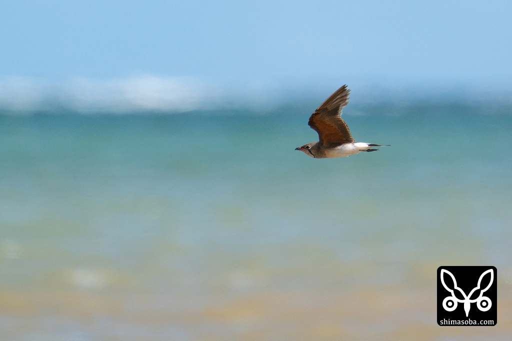 海をバックに飛ぶ、ツバメチドリ成鳥。冬羽への換羽が始まっています。