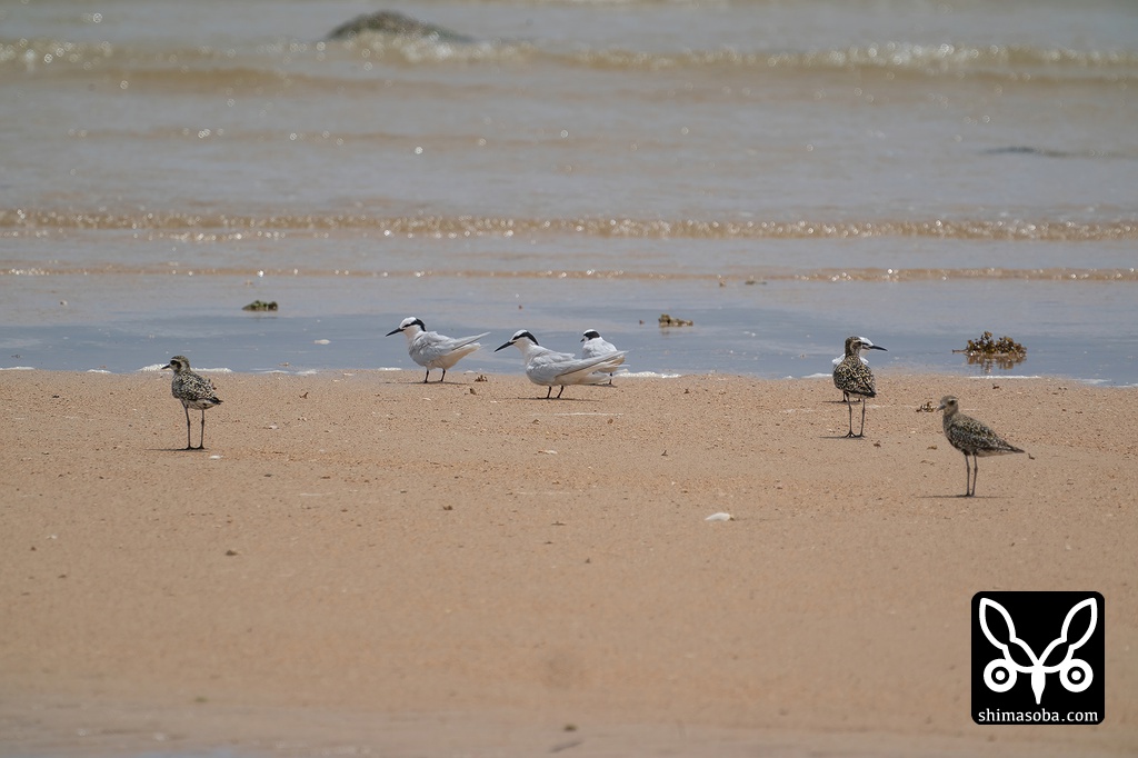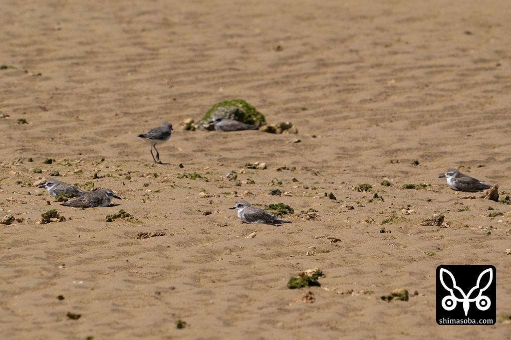 砂浜で休むオオメダイチドリとメダイチドリ。