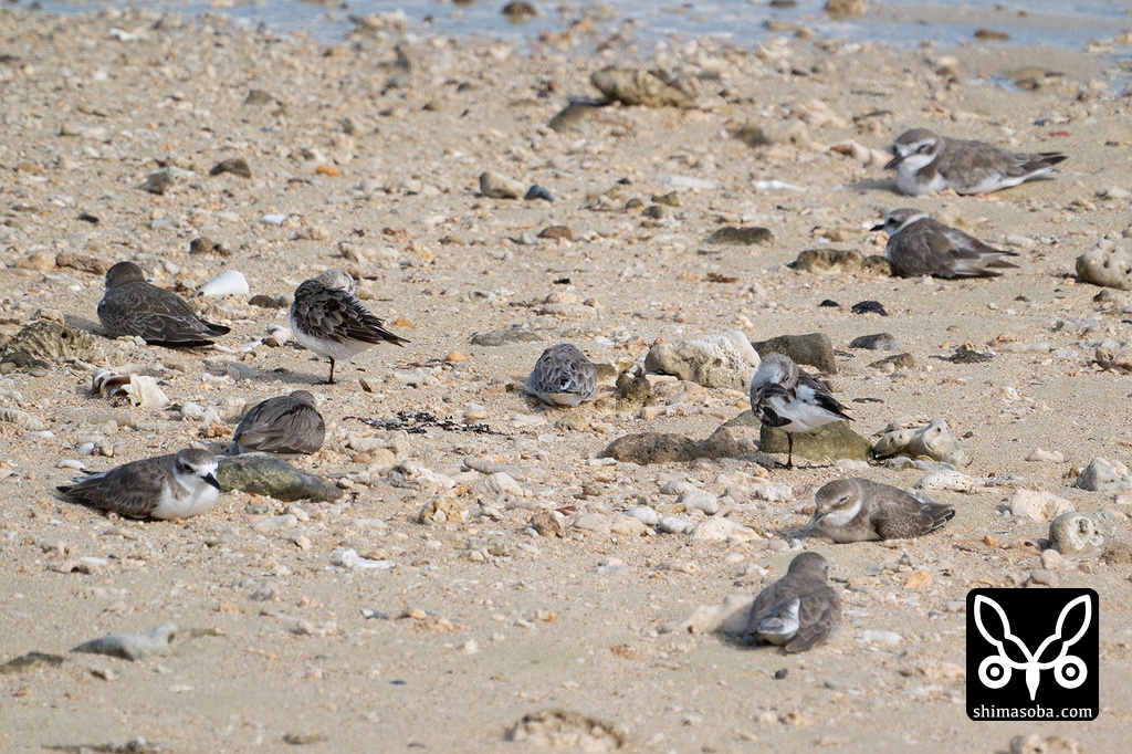 トウネン、ソリハシシギ、メダイチドリ、シロチドリの昼寝。