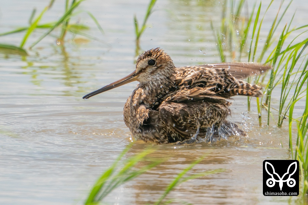 水浴びを始めたジシギ。これも分かりやすいハリオシギ成鳥です。