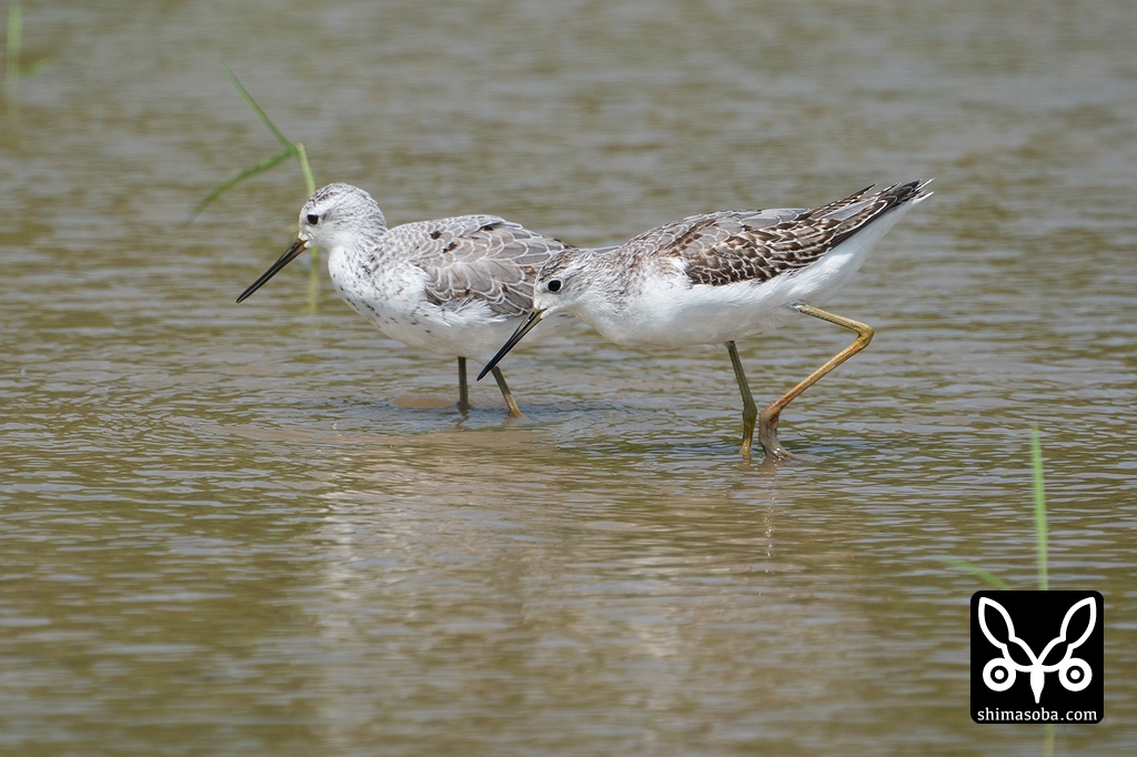 コアオアシシギ幼鳥(手前)と冬羽に変わりつつある成鳥。