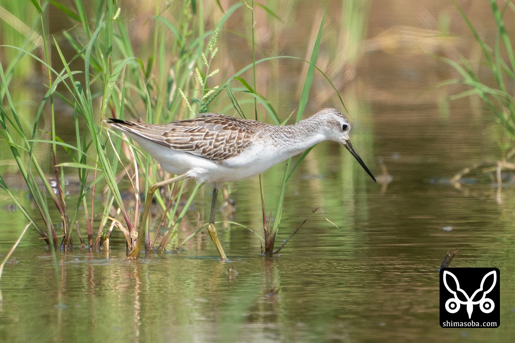 数枚の冬羽が見えていますが、ほぼ幼羽のコアオアシシギ。