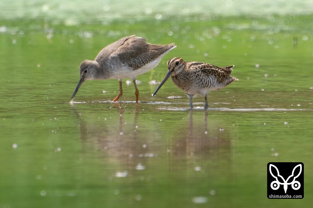 チュウジシギ(手前)とアカアシシギ。